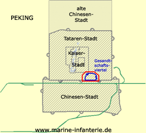 Mit verstärktem Aufkommen von Übergriffen der Yihetuan (Boxer) im Umfeld von Peking, forderten die Gesandten Schutzdetachements für die Gebäude und Personen an. Das Deutsche Reich entsandte daher auf Anforderung des Gesandten vom 29. Mai 1900 vom III. Seebataillon aus Tsingtau unter Führung von Oberleutnant Graf von Soden ein Detachement mit 5 Unteroffizieren und 45 Mannschaften. Diese verlegten vom 29. Mai - 01. Juni 1900 an Bord von "SMS Kaiserin Augusta" auf die Reede von Taku und erreichten am Abend des 03. Juni 1900 mit einem Extrazug aus Tientsin die Stadt. Nur wenige Tage später, am 10. Juni 1900, wurde die telegraphische Verbindung und ab 12. Juni 1900 die Eisenbahnlinien nach Peking durch die Yihetuan unterbrochen. Damit war die Stadt eingeschlossen. |