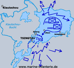 den feindlichen Angriff zuversichtlich erwarten. Dazu wurde zunächst das III. Seebataillon mobilisiert und das Ostasiatische Marinedetachement nach Tsingtau verlegt. Alle zum Kreuzerkrieg fähigen Kriegsschiffe (Kreuzer "Emden") verließen den Hafen. Nachdem mit dem japanischen Ultimatum vom 15. August 1914 klar war, dass auch Japan zu den Gegnern zählen würde, bereitete das Gouvernement auch die landseitige Verteidigung vor. |