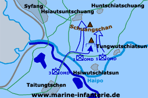 Um 21.00 Uhr begann der Angriff, welcher auf dem linken Flügel schnell zum tiefen Einbruch im Zuge der Straße nach Hsiau-tschun-tschuang und auf dem Westabhang des Schunag-schan führte. Dabei gelingt es der 2. Kompanie die Kuppe der Höhe ohne Widerstand zu nehmen. Auf dem rechten Flügel hingegen entwickelt sich die 1. Kompanie mit zwei Zügen vorn (links Leutnant d. Res. Below, rechts Oberleutnant Baake) und einem Zug in der rechten Flanke (Wünsche). Die vorderen beiden Züge warfen leichte japanische Infanterie und gelangten bis zu 50 m unterhalb der Kuppe. Überraschend setzte dann starkes Infanterie- und MG-Feuer in der rechten Flanke ein. Dies ließ Oberleutnant Baake ein Abschneiden seines Zuges befürchten und ihn daher den Rückzug befehlen. Der Zug Below ging daher mit zurück, während zum rechten Zug Wünsche keine Verbindung bestand. Um 23.00 Uhr befahl der Kommandeur des OMD, Oberstlt Kuhlo, aufgrund des Erfolgs bei der 2. Kompanie auf dem linken Flügel (Auftrag erreicht) und der unklaren Lage mit starkem Widerstand auf dem rechten Flügel bei der 1. Kompanie den Rückzug. Gegen Mitternacht waren die Kompanien wieder zurück hinter den eigenen Linien. |